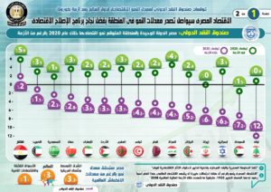 وفيما يخص الإنفوجراف الحالي، فقد أبرز توقعات صندوق النقد الدولي لمعدلات النمو الاقتصادي لدول المنطقة خلال عام 2020، والذي توقع أن يصل معدل نمو الاقتصاد المصري إلى 2% خلال أزمة كورونا- وتستهدف الحكومة معدل نمو 4.2%- بعدما كانت التوقعات وفقًا للصندوق تشير إلى أنه سيصل إلى 5.9% قبل الأزمة، تليه الكويت بمعدل انكماش 1.1% خلال الأزمة، بعدما كان متوقع أن يحقق معدل نمو 3.1% قبل الأزمة، ثم السعودية بمعدل انكماش 2.3% خلال الأزمة، بعدما كان متوقع أن تحقق معدل نمو 1.9% قبل الأزمة، وعمان بمعدل انكماش 2.8% خلال الأزمة، بعدما كان متوقع أن تحقق معدل نمو 3.7% قبل الأزمة، والإمارات بمعدل انكماش 3.5% خلال الأزمة، بعدما كان من المتوقع أن تحقق معدل نمو 2.5% قبل الأزمة.