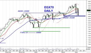 اذا ما تم النظر الى الرسم البياني اليومي للمؤشر الرئيسي egx70 نجد ان علي المدي قصير الاجل نجد ان هناك تباين واضح بين القوي الشرائيه ونظيرتها البيعيه علي المدي القصير والمتوسط الاجل حيث لا تستطيع اي قوي السيطره علي الاخري مما ادي الي تحرك السوق علي المدي متوسط الاجل في اتجاه عام عرض بين مستويات 9100 كمستويات مقاومه رئيسيه ومستويات 8400 كمستويات دعم رئيسي لذلك ننصح المستثمرين علي المدي متوسط الاجل بالمتاجره بين الحدود السعريه السابق ذكرها .