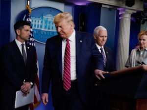 والآن، يصرخ الاقتصاد ويتراجع سوق الأسهم في هبوط حر. وقالت شركات صناعة السيارات الثلاث الكبرى يوم الخميس إنها ستغلق مصانعها يوم 30 مارس/آذار الجاري، وتغلق شركة ماريوت -أكبر شركة فندقية في العالم- فنادقها وتسرّح آلاف العمال.