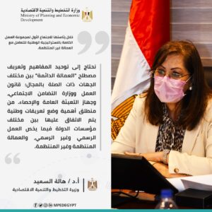 قالت الدكتورة هالة السعيد، وزيرة التخطيط والتنمية الاقتصادية إننا نحتاج إلى توحيد المفاهيم وتعريف مصطلح “العمالة الدائمة” بين مختلف الجهات ذات الصلة بالمجال: قانون العمل ووزارة التضامن الاجتماعي، وجهاز التعبئة العامة والإحصاء، من منطلق أهمية وضع تعريفات وطنية يتم الاتفاق عليها بين مختلف مؤسسات الدولة فيما يخص العمل الرسمي وغير الرسمي، والعمالة المنتظمة وغير المنتظمة.