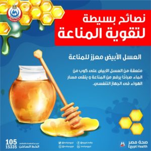 وجهت وزارة الصحة والسكان، عدة نصائح لتقوية المناعة لدى المواطنين، وذلك عبر إنفوجراف نشرته الوزارة على صفحتها الرسمية بموقع التواصل الاجتماعى “فيسبوك”، والذى يوضح أهمية الفيتامينات والعسل الأبيض للمساعدة فى تقوية المناعة وتنقية مسار الهواء فى الجهاز التنفسى، وجميعها إجراءات هامة للوقاية من فيروس كورونا المستجد “كوفيد 19”.