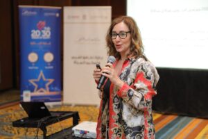 وشهدت الجلسة الختامية لليوم الأول كلمة الأستاذة / نهاد أبو القمصان، خبير اول تمكين المرأة واستشاري بمشروع الحوكمة الاقتصادية حول ” تمكين المرأة وتكافؤ الفرص” في مجال العمل وأثره سواء على المستوى العام اجتماعيا واقتصاديا بما يساهم في توسيع نطاقة التنمية الاقتصادية والاستفادة من الكوادر النسائية والكفاءات المتاحة بما ينعكس إيجابيا على أداء المؤسسات من خلال تقلدها لمناصب الإدارة العليا إضافة الى تأثيرها على مستوى الاسرة حيث اشارت تأكيد العديد من المؤسسات الاقتصادية وفى مقدمتها البنك الدولي على ان عمل المرأة يساهم في رفع مستوى معيشة الاسرة بما ينعكس على جودة الحياة.