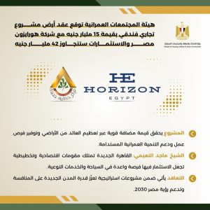 وقد جرى توقيع الاتفاقية في مقر هيئة المجتمعات العمرانية الجديدة بين معالي سمو الشيخ الدكتور ماجد بن سعيد النعيمي، رئيس مجلس إدارة شركة هورايزون مصر للتنمية العمرانية، والمهندس أحمد علي محمد حسن، نائب رئيس الهيئة لقطاع الشؤون العقارية والتجارية، وذلك بحضور قيادات الهيئة وشركة هورايزون ومجلس إدارتها. وتأتي هذه الخطوة تنفيذًا لتوجيهات السيد المهندس شريف الشربيني، وزير الإسكان والمرافق والمجتمعات العمرانية، ورئيس مجلس إدارة هيئة المجتمعات العمرانية الجديدة، بضرورة دعم الشراكات الاستثمارية ذات العائد الاقتصادي المرتفع، وتوفير بيئة تنموية محفزة تسهم في تعظيم موارد الدولة، ورفع كفاءة استغلال الأصول، وفق رؤية اقتصادية وتنموية متكاملة تعزّز من تنافسية المدن العمرانية الجديدة.