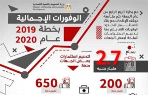 وفيما يتعلق بالوفورات الإجمالية أوضحت السعيد أنه في ضوء ما تقضي به التأشيرات العامة للموازنة العامة للدولة بخطة عام 2019/2020 بزيادة الاستثمارات للمشروعات المدرجة بجهات الاسناد أخذًا من الوفورات الاجمالية للخطة، فمع بداية الربع الرابع من عام الخطة يتم متابعة موقف الاتاحات مع بنك الاستثمار لتحديد الوفورات التي يتم بها تدعيم الاحتياجات الملحة والضرورية لبعض الجهات الأخرى، موضحة أنه تم حصر مبلغ بنحو 2,7 مليار جنيه تركزت في تدعيم استثمارات عدة جهات بالدولة.
