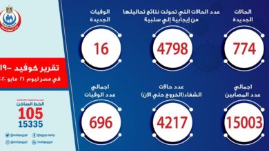 الصحة: تسجيل 774 إصابة جديدة بفيروس كورونا.. و16 وفاة