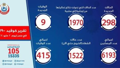 الصحة: تسجيل 298 حالة إيجابية جديدة لفيروس كورونا..و9 حالات وفاة